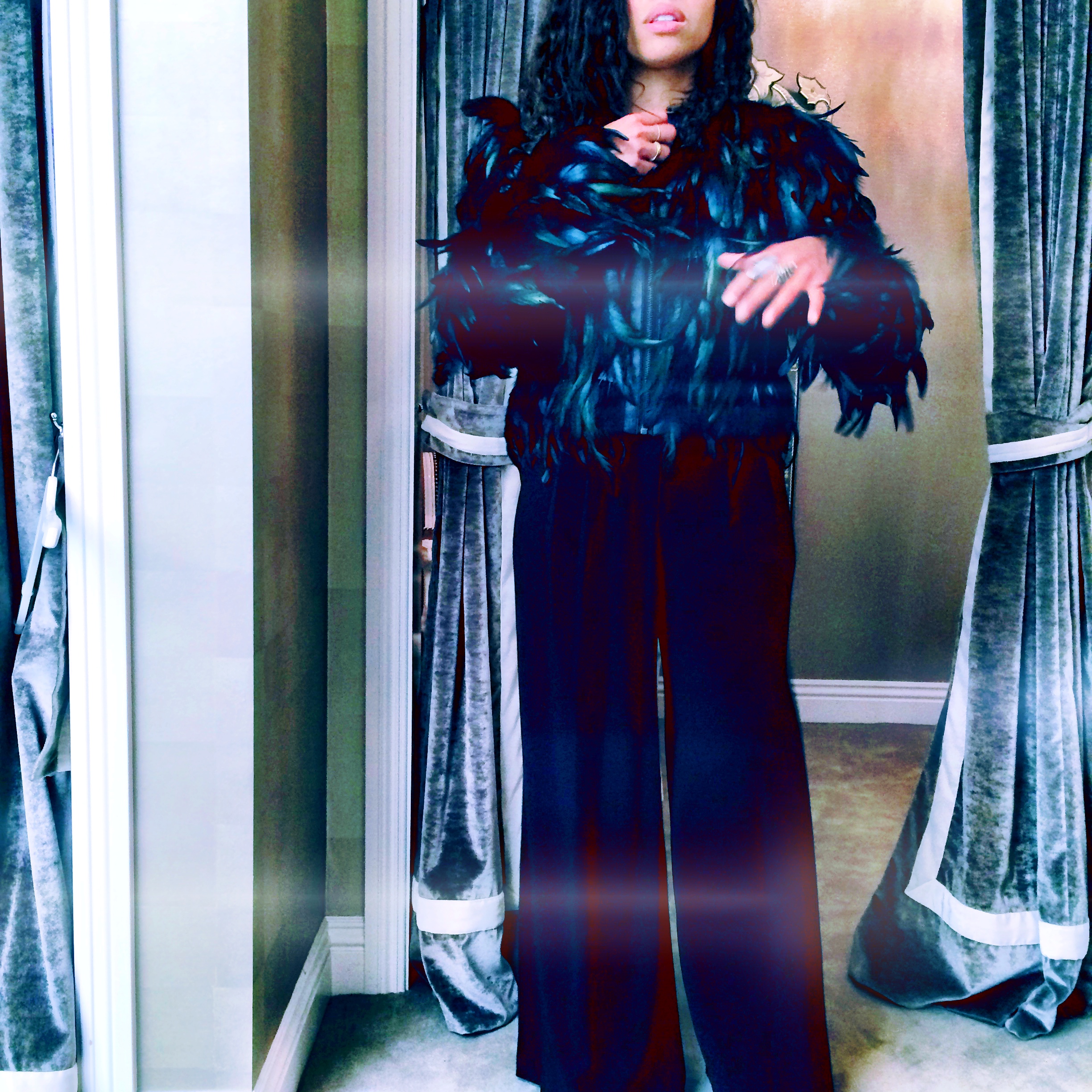 Tarred and Feathered on Rodeo Drive. Chaser Brand feather bolero Jacket // moonstone rings// palazzo pants